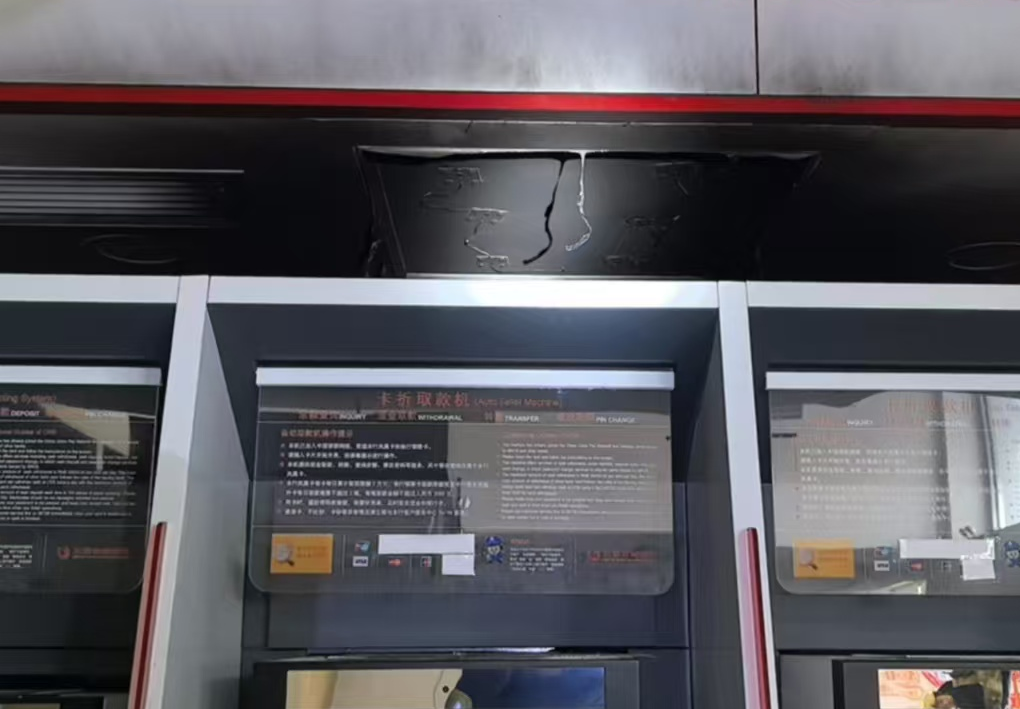 經消防救援站到場核實,現場為ATM機上方的方形照明燈起火,起火原因為電氣線路故障所致。