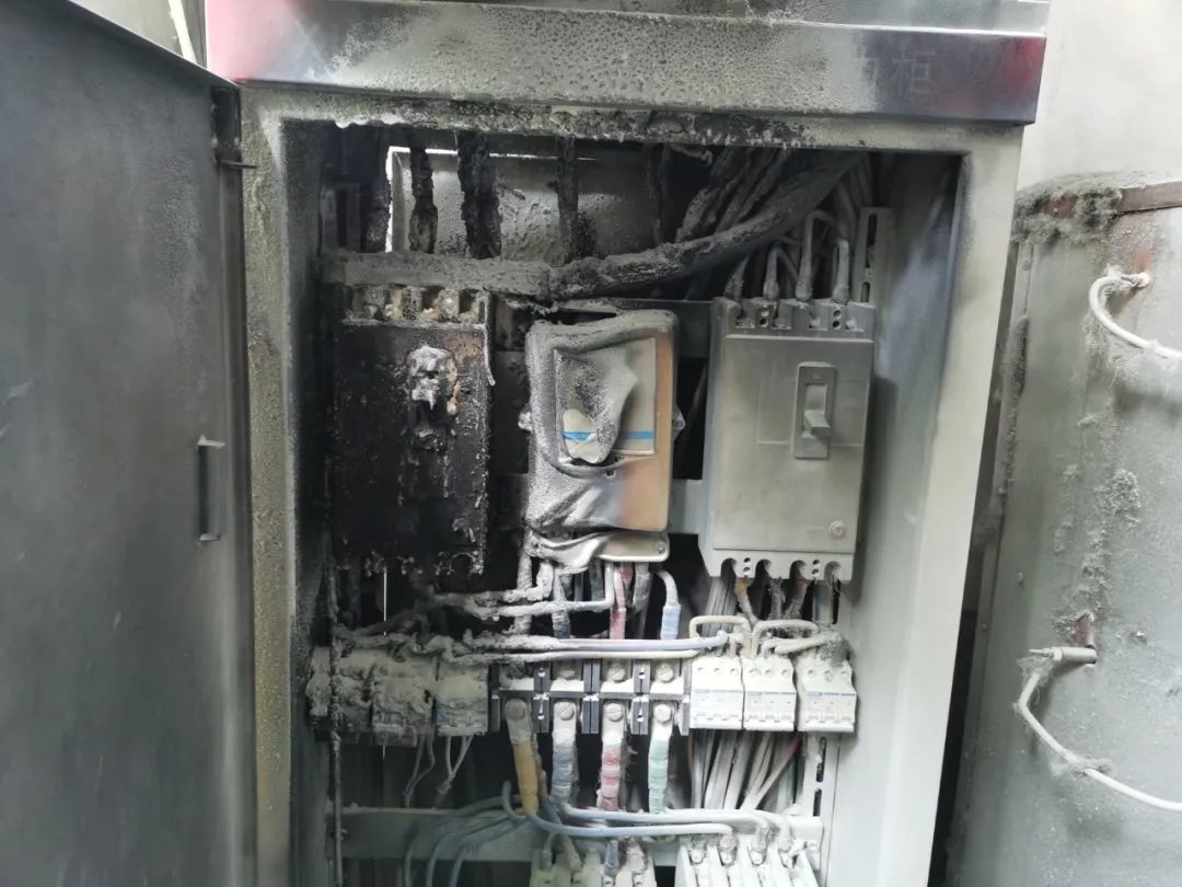 當中心巡檢人員抵達現場時,老板正在處置,隨即巡檢人員協助老板處置,發現該商戶配電箱內空開與電線已經燒焦。